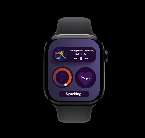 The wearable enables fast, glanceable interactions. It displays live track info, biometric feedback, and one-tap controls while offering subtle haptics that align with activity and mood.