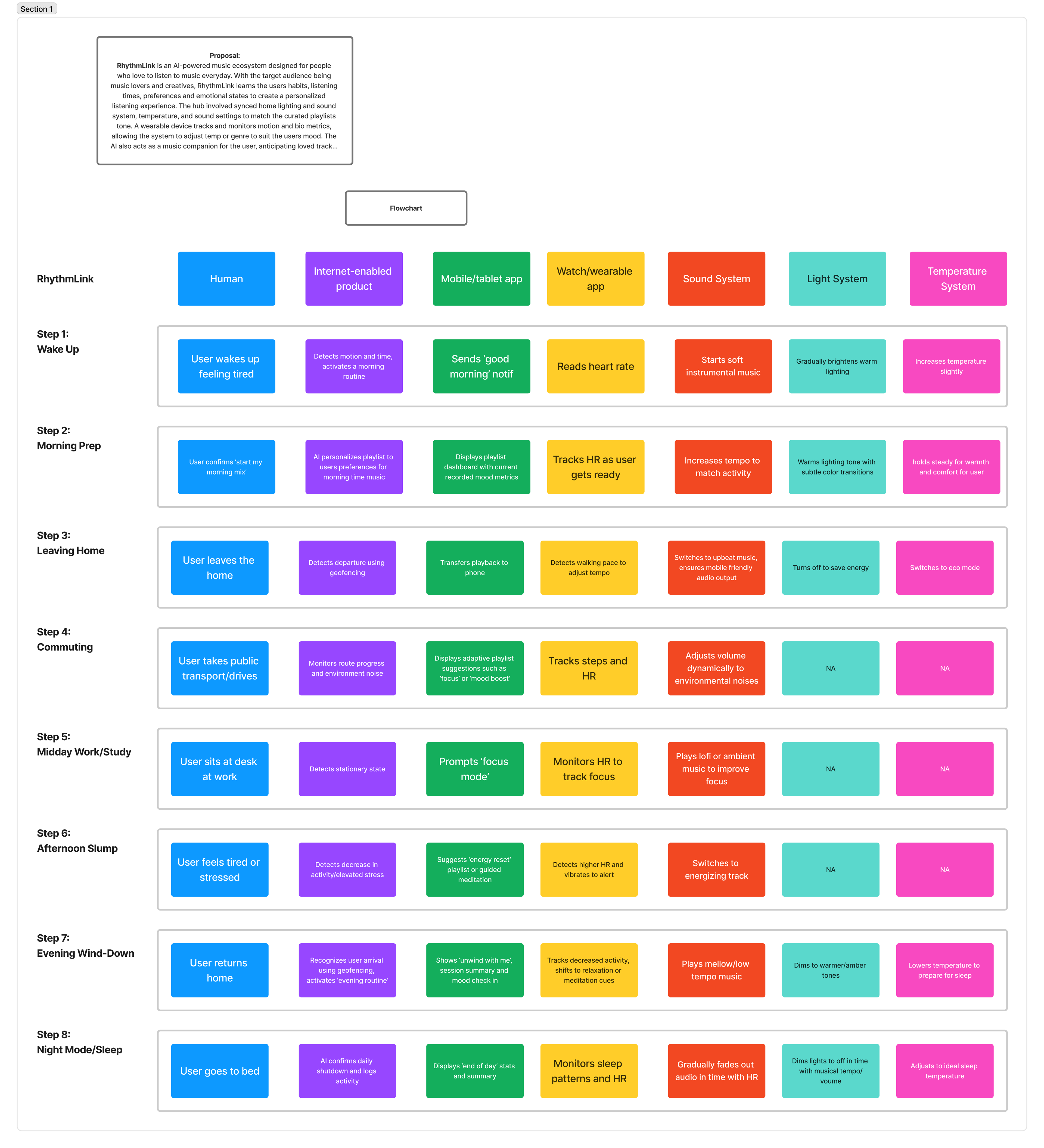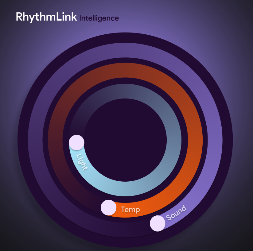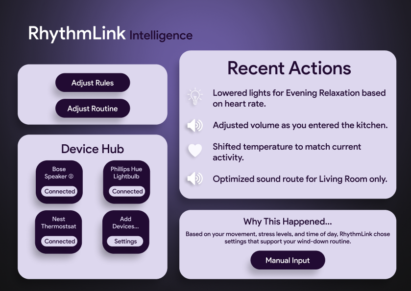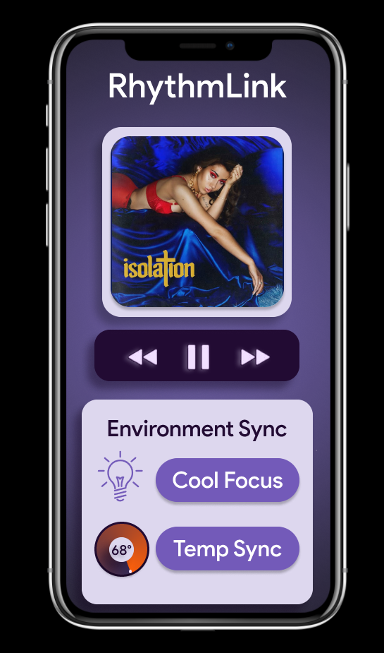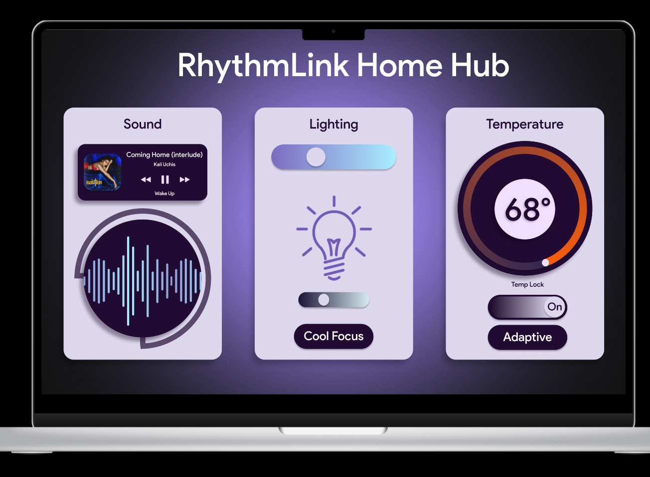 This visualization shows how RhythmLink synchronizes audio, lighting, and temperature across the home. The interface highlights how the system adapts to mood, rhythm, and context in real time.
