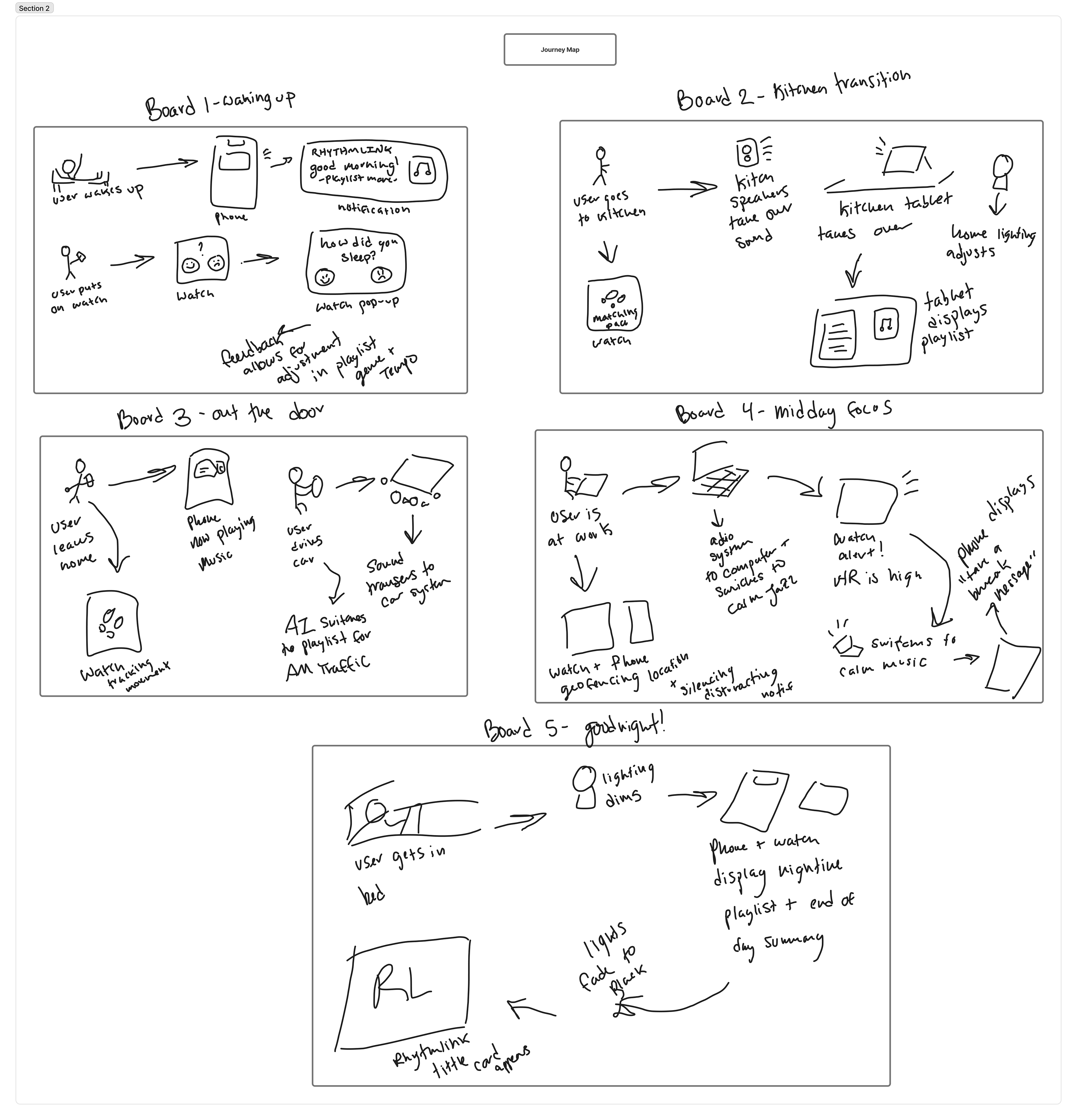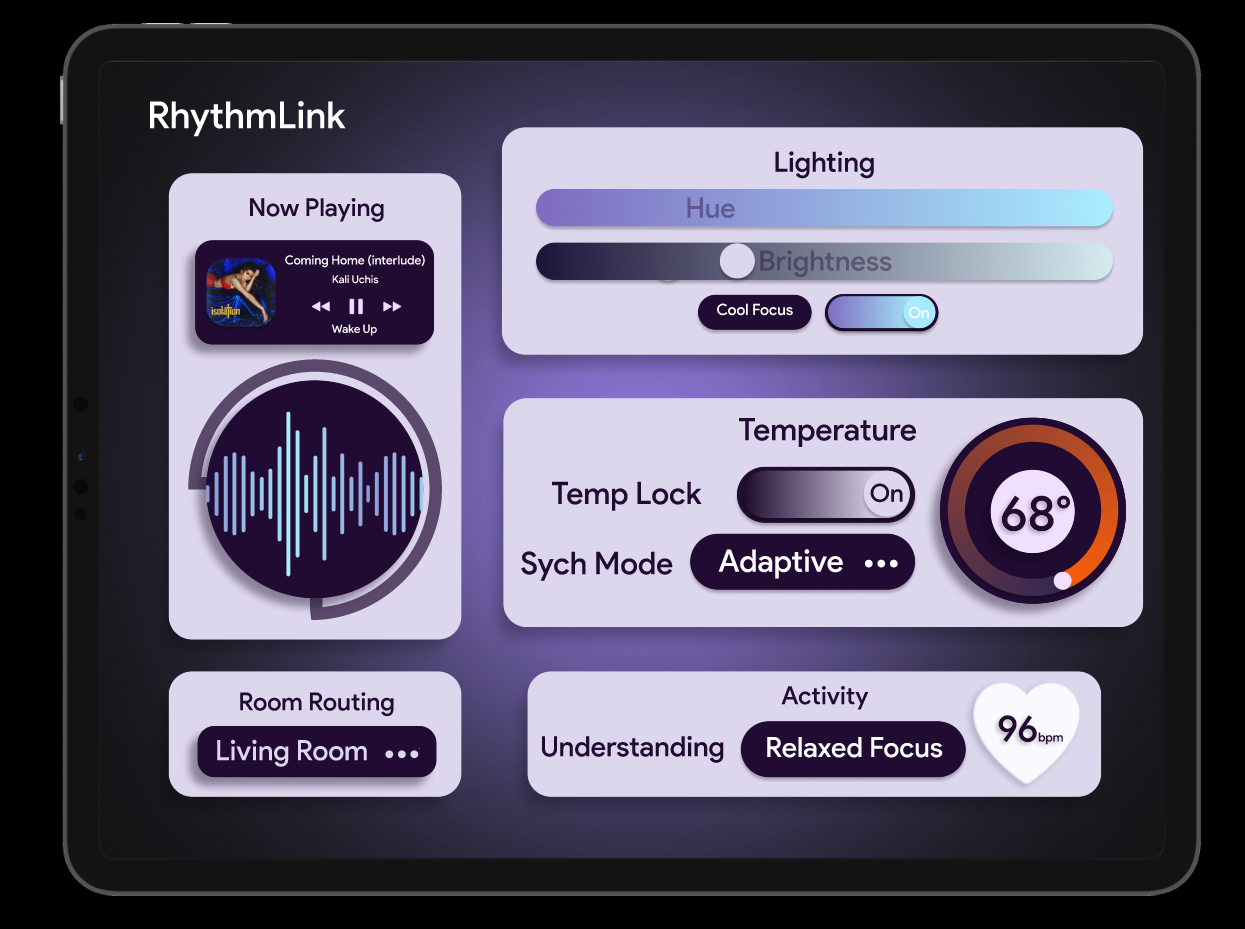 This tablet interface acts as the mid-level control surface for RhythmLink. Users can manage music playback, lighting, temperature, and room routing in one cohesive dashboard, with real-time adjustments driven by biometric and contextual signals.